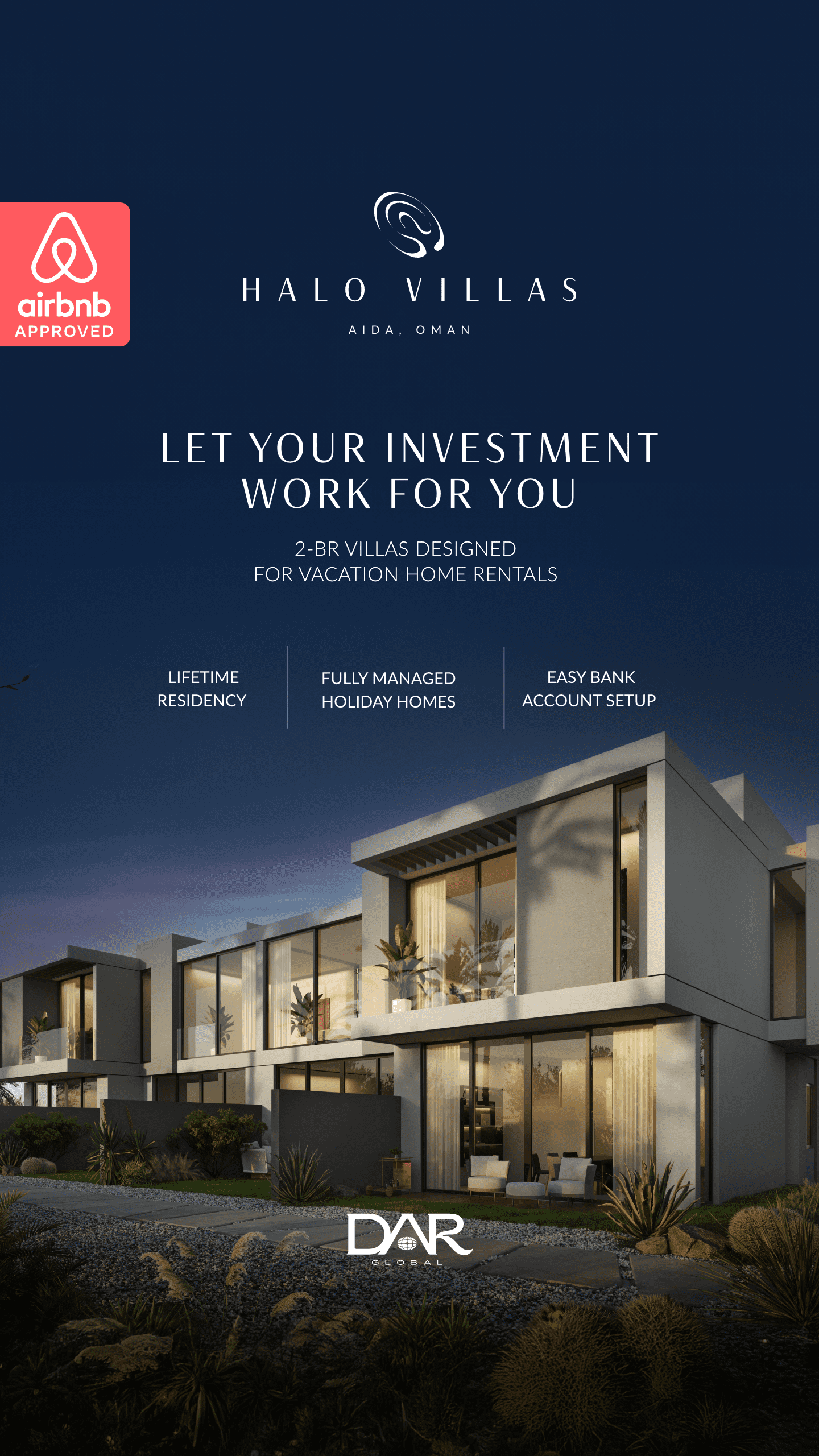 Halo Villas is an exclusive residential community developed by DarGlobal, a globally renowned luxury real estate brand. Nestled in Muscat, this project blends contemporary architecture with Oman’s natural beauty, offering a lifestyle defined by elegance, privacy, and premium living standards.