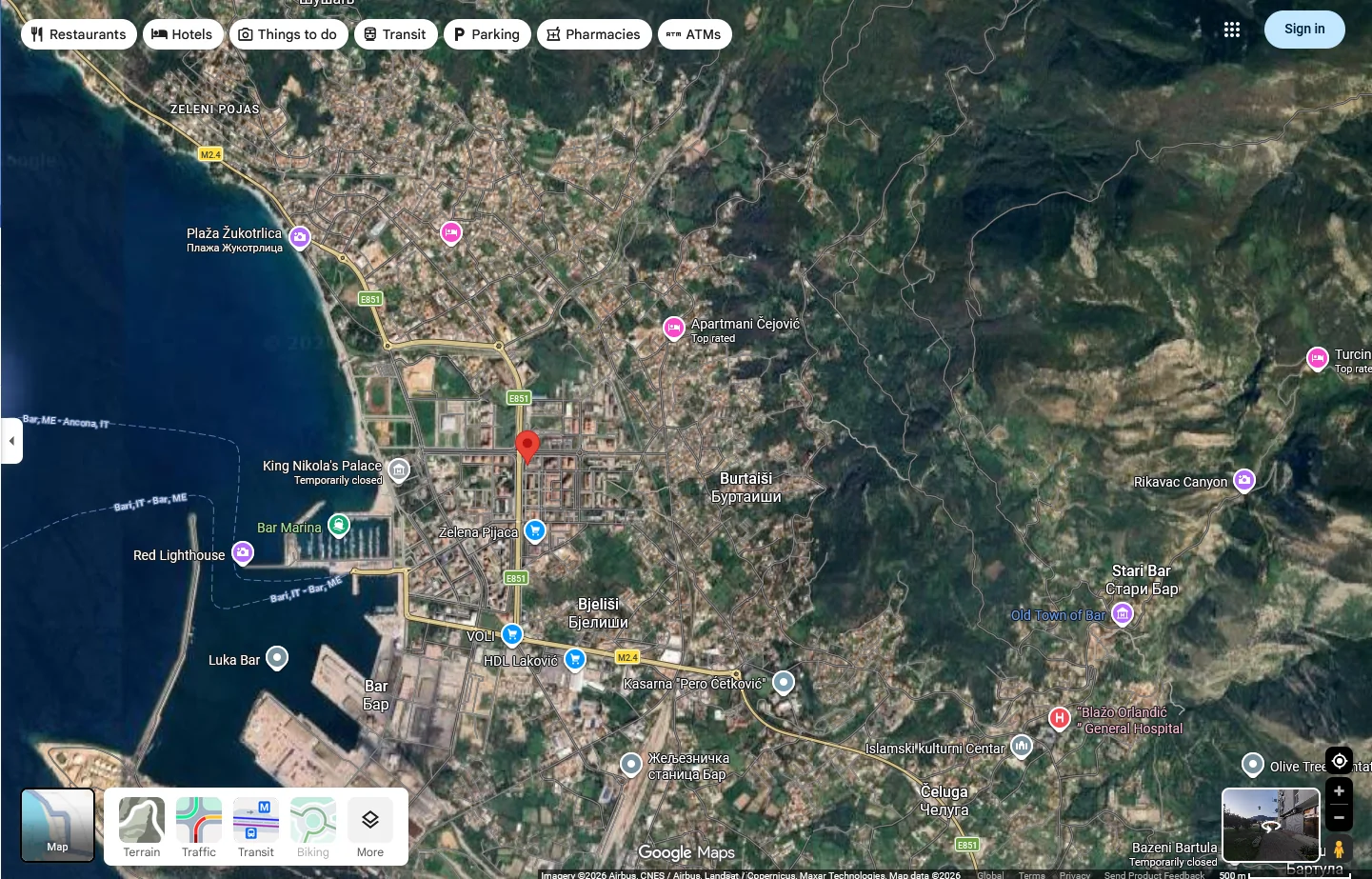 The town of Bar is comfortably situated on a large flat area between the mountains and the sea. It is connected via highway to the entire coastal area and the capital. It has well-developed infrastructure, including the port, railway and bus stations, supermarkets, schools, etc.
