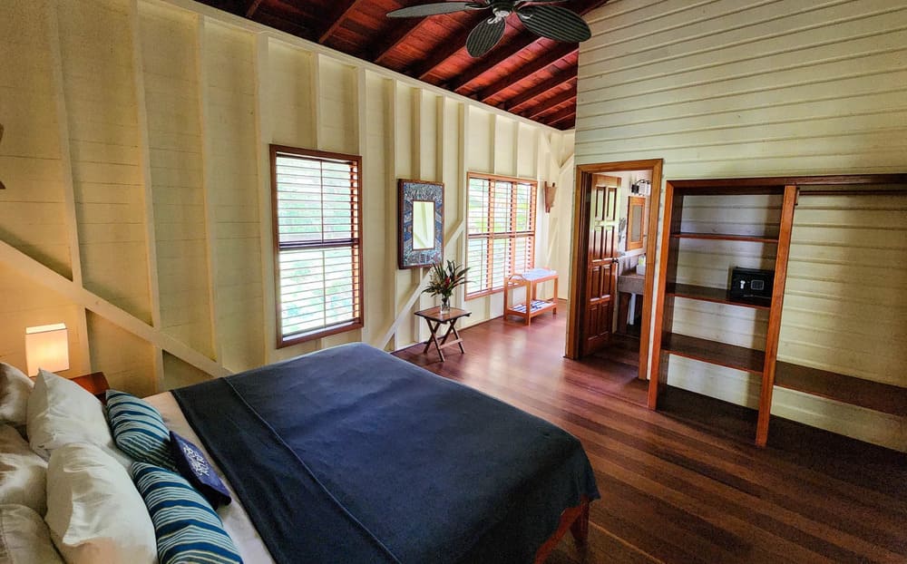 La Playa Casita is a 2 story 3 bedroom/3 bathroom home. There is a large garden floor bedroom with 3 double beds and one bathroom, and covered patio. Upstairs is a covered veranda, a full kitchen and living room, and 2 mirrored bedrooms each with their own bathrooms. Behind the garden suite room are the rain water collection tanks, the solar system, a large wine celler/food storage, and a massive room for housekeeping materials and laundry.