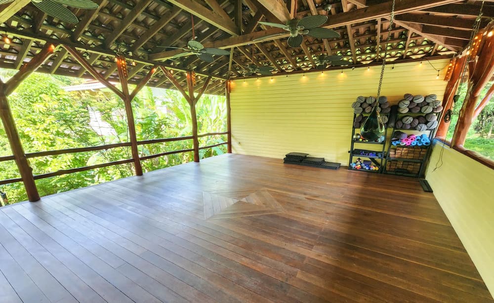 The Yoga Studio is a large open air platform surrounded by the mature garden, and with glimpses of the sea. The platform is 7×10 meters and fits up to 20 yogis. Discreetly tucked beneath the studio is an apartment for the managerial staff.