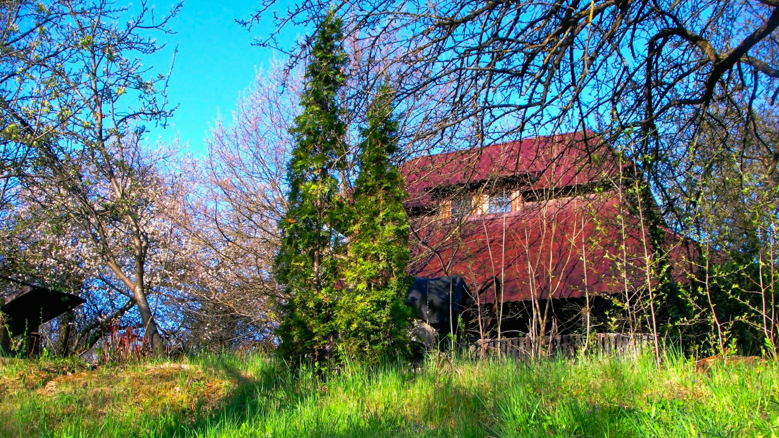 Mature orchard: cherry, walnut, pear, apple, plum trees, and more