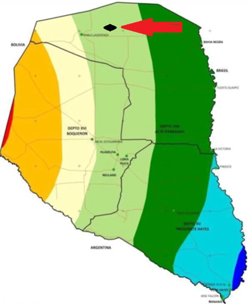 The polygonal area, according to a court-ordered survey, of the total ranch is 61,923 hectares. Fully registered with the National Cadastre Service. The topography features soil that, unlike others typical of different regions, boasts rich mineral content, defining it as highly fertile. In recent years, agriculture has developed significantly in the area, with excellent results. Among the main tree species found in this region are Palo Santo, Coronillo, Quebracho Colorado, Curupay, Trébol, Urundey, and Lapacho, among others. Hydrology: the property in question has numerous watering holes, watering troughs, watercourses, and a stream that crosses it, in addition to a modern water storage system consisting of two reservoirs with a capacity of 1,000,000 liters each; another of 750,000 liters; and seven dams with a total capacity of over 200,000 m³. In addition to three artesian wells equipped with Australian tanks, all interconnected to an extensive underground network of pipes that supply drinking troughs strategically located in the pastures, thus guaranteeing a constant and stable supply of water throughout the year, average rainfall fluctuates between 700 and 1,000 mm annually, with the highest rainfall occurring during the summer months. The groundwater in almost the entire Alto Paraguay Department is fresh.