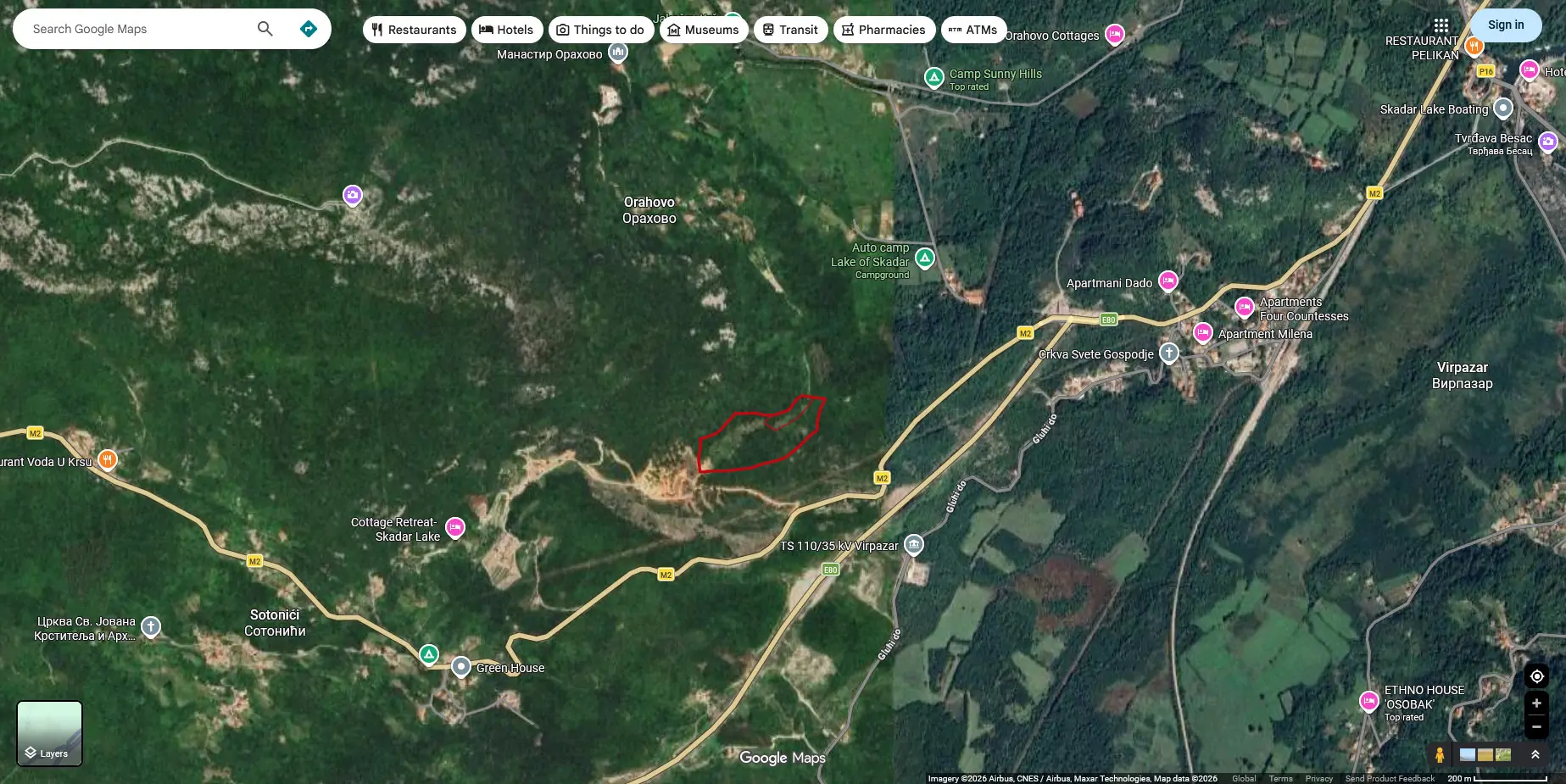 The land is located between the capital and the coastal area, near the highway which connects them. It is within a 30-minute drive of both the Port of Bar and Podgorica (the capital city). The nearest seaside beach is a 15-minute drive away, and the promenade area of Lake Skadar is a 10-minute drive away. There is an eco-village near the plot.