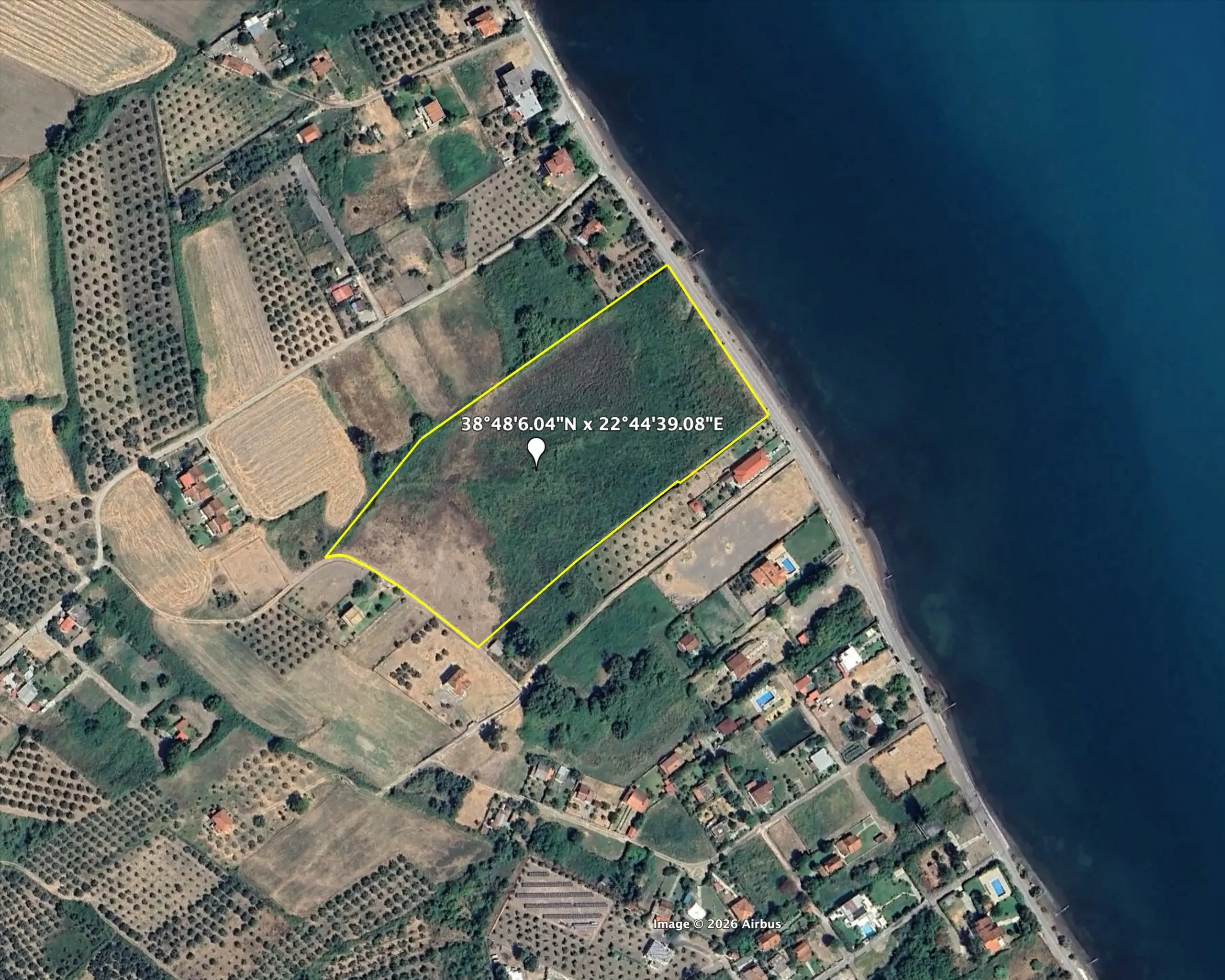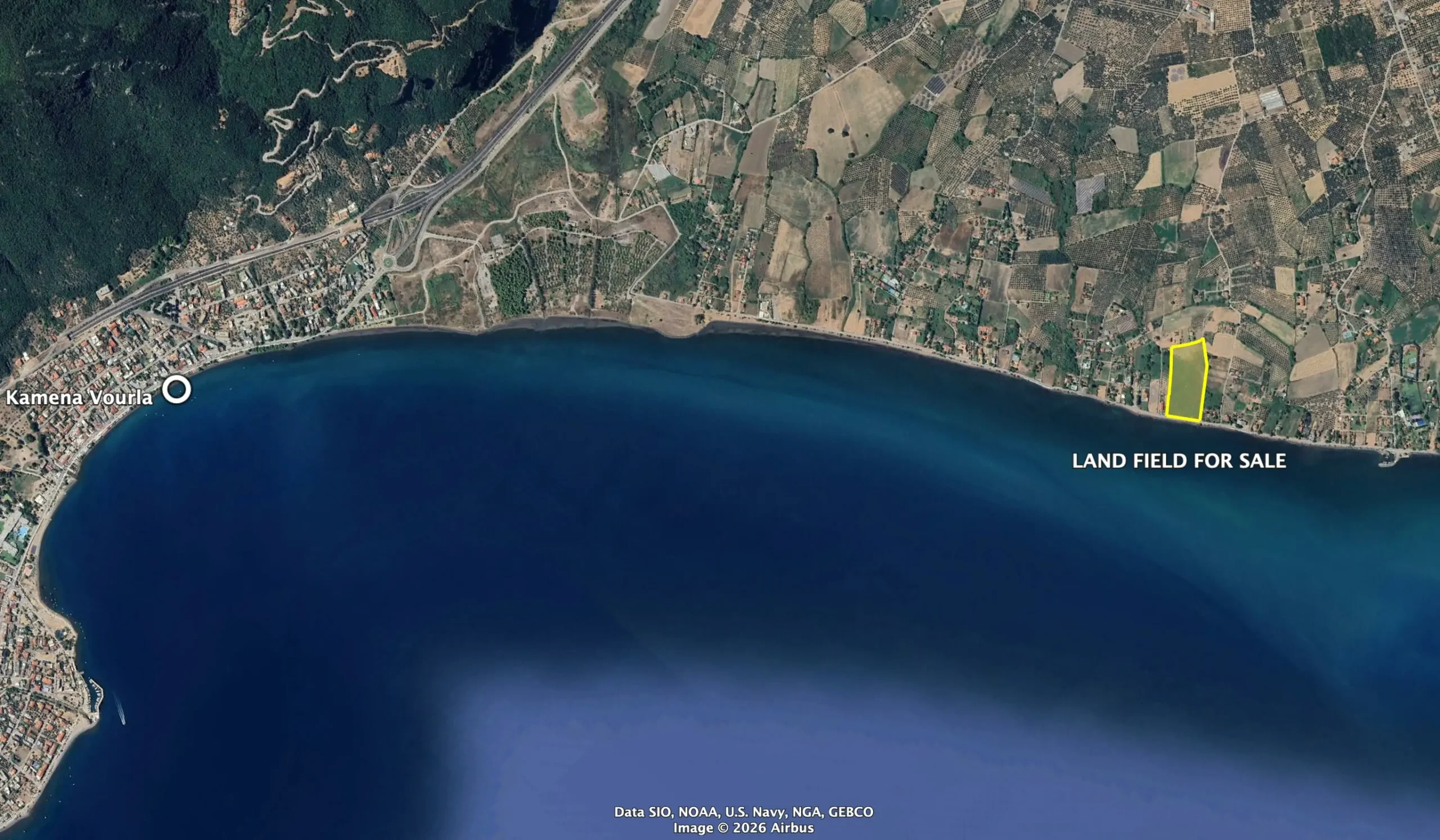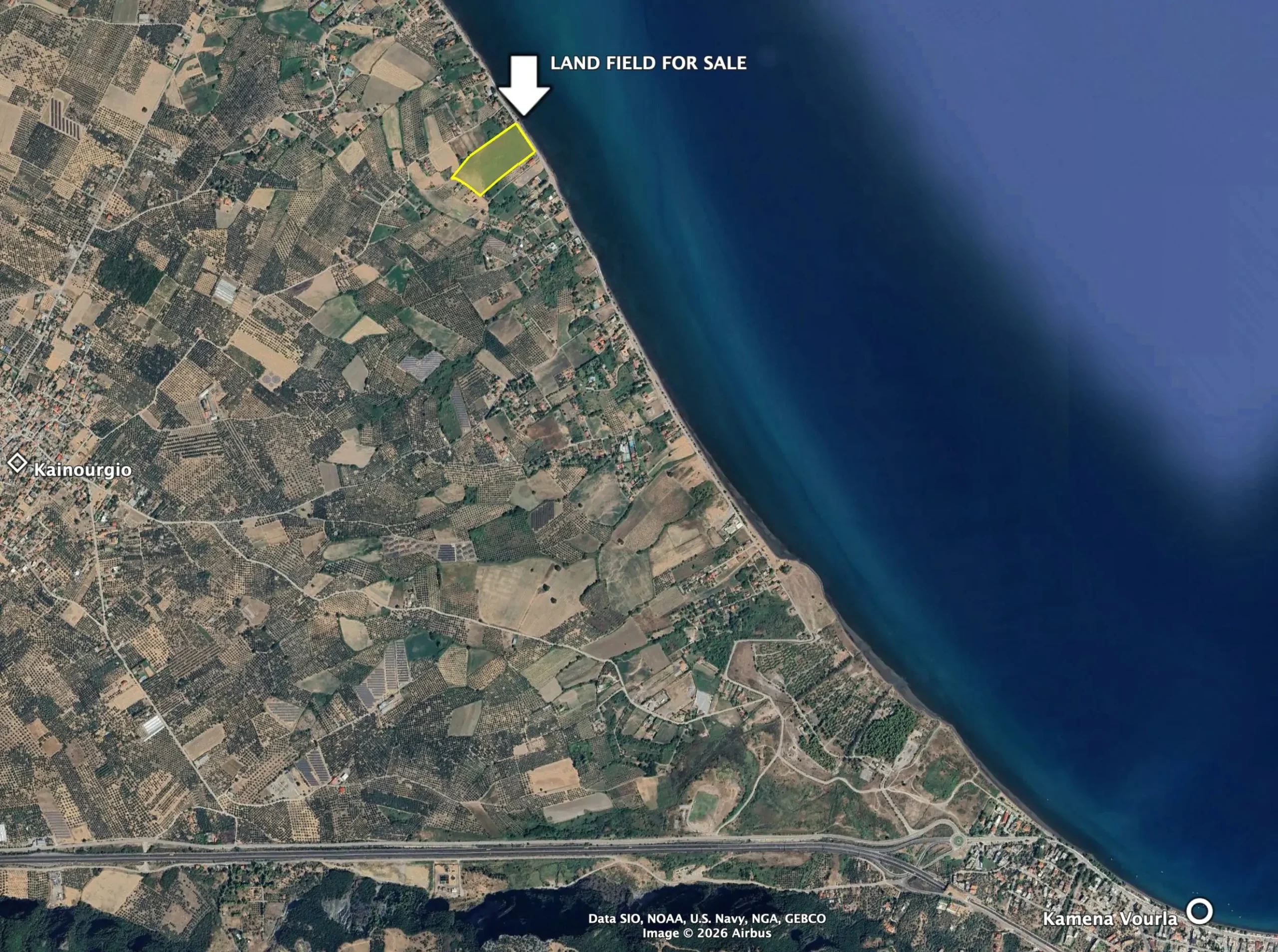 - Neighborhood Description: The general Kamena Vourla area is a classic summer resort placed in Locris, Greece, and a well sought international tourist destination famous for its hot springs and spas, amazing beaches and local cuisine. === Very close to Athens, capital of Greece (185 kms, less than two hours from international airport via highway) and easily accessible from the sub-capital Salonica / Thessaloniki (320 kms), Kamena Vourla town holds the seat of municipality with full public services and facilities. === International interest for real estate investment is rising in the general Kamena Vourla area as buyers are searching for alternatives to over-populated resort destinations while at the same time cleverly placing themselves in the very center of a new fast-growing market. === The extremely attractive Kainourgio beach where the coastal land field offered for sale is placed, is very close to Kamena Vourla town, less than 3 kms away. === The whole coastal area is currently gently developed with high-class villas and small tourist facilities with the strong support of the local municipality. === Although the general area is famous as a summer resort, the mild winter offers many opportunities for vacation all year round.