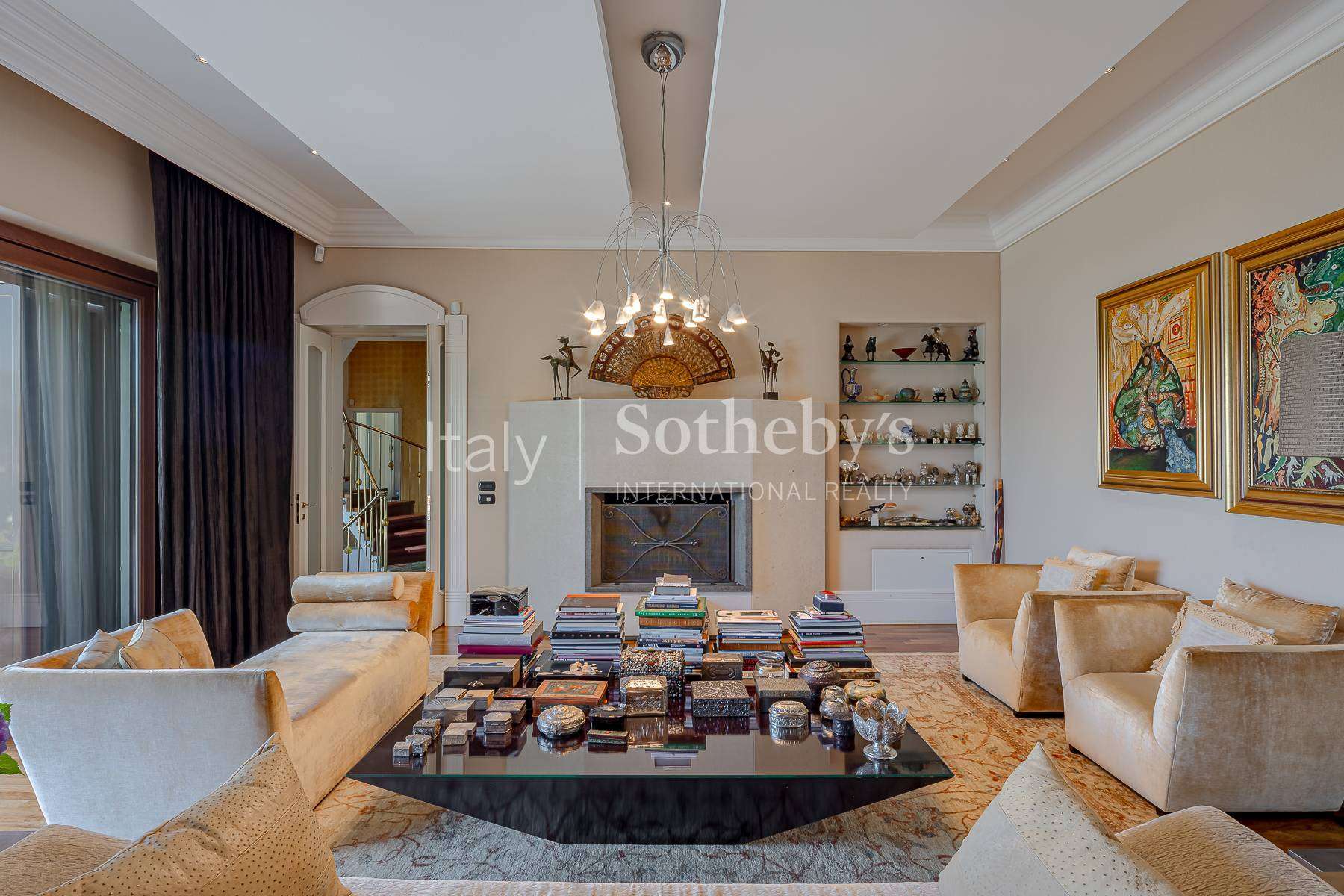This charming 18th-century villa combines history, art and comfort through rooms rich in scenographic details: gold leaf walls, onyx floors, bathrooms in fine marble and Murano glass chandeliers. The property enjoys a dominant position, with spectacular views from every room. The elegant gold and onyx entrance leads to a large living room with fireplace and a terrace overlooking the private park.