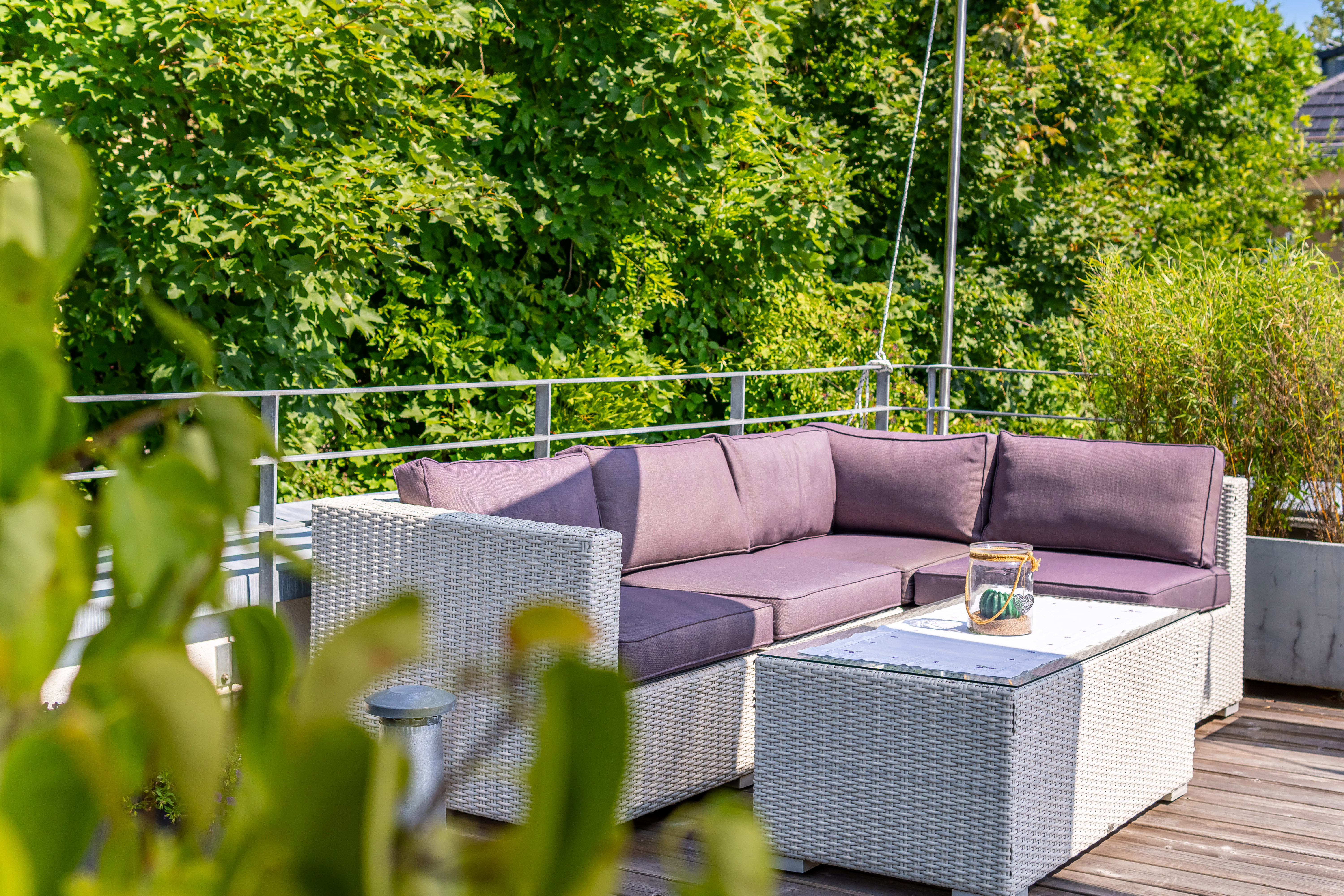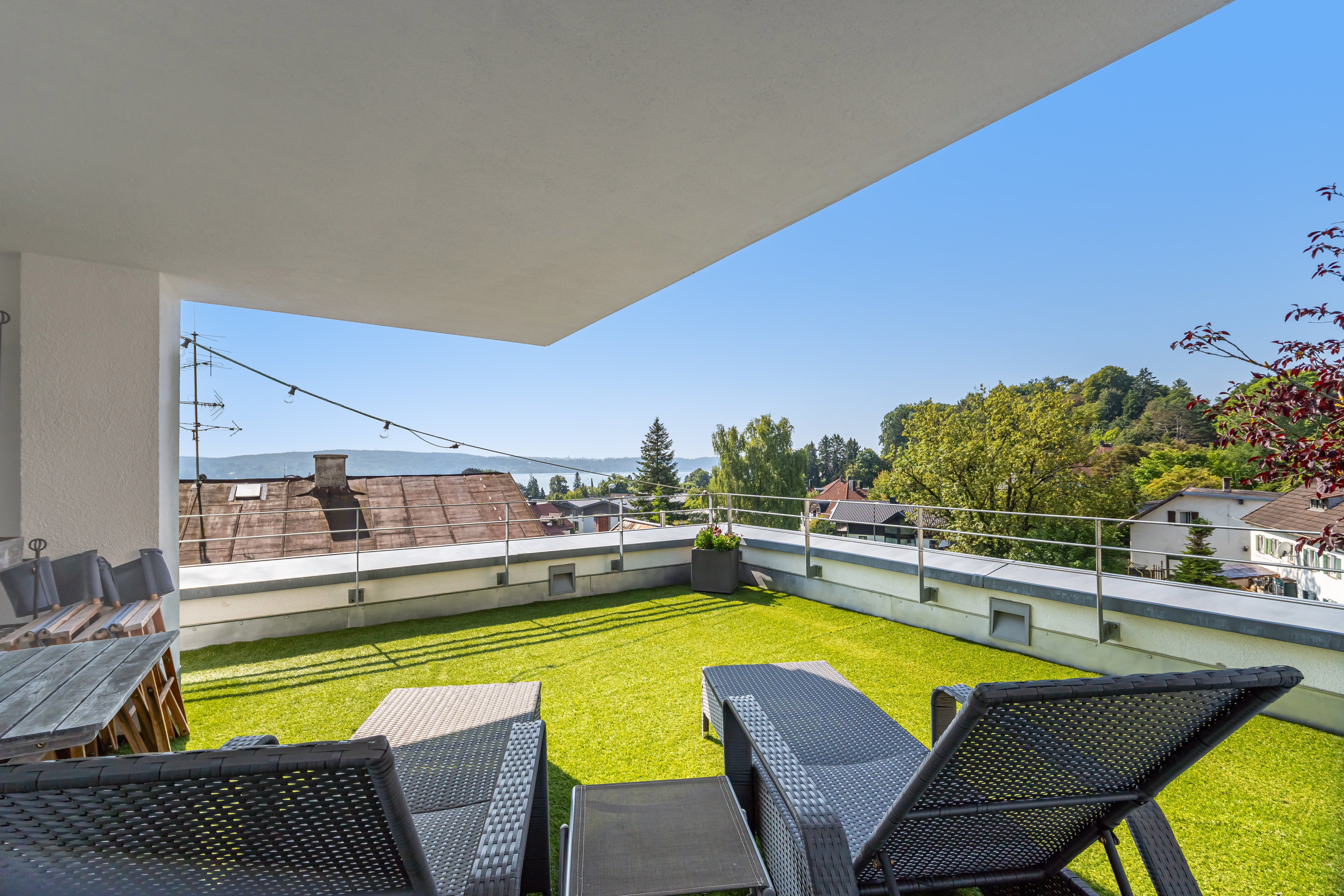 The spacious south-facing terrace offers an impressive panoramic view of Lake Starnberg and invites you to relax outdoors. All rooms in the house have access to a terrace or balcony, creating a close connection to the surrounding nature. Floor-to-ceiling glass fronts let in plenty of daylight and create a bright, open living space.