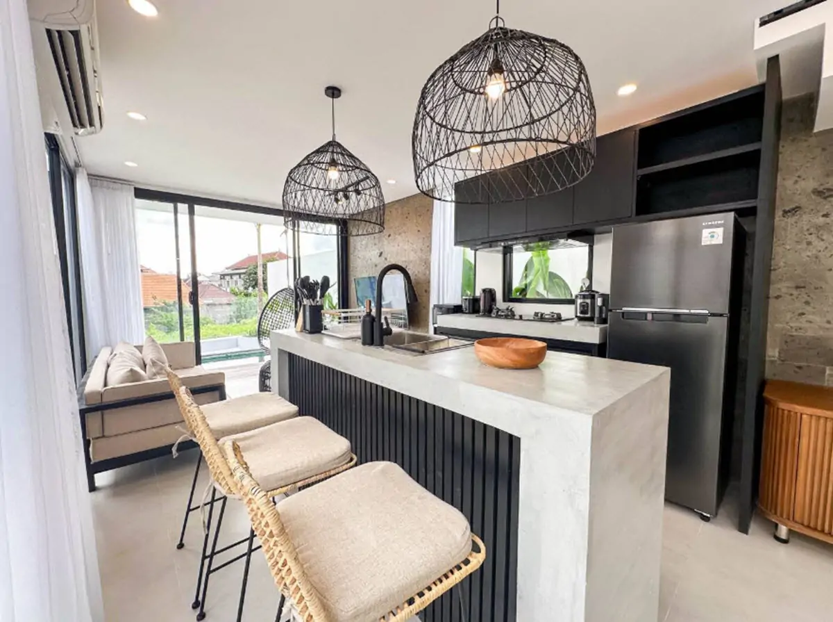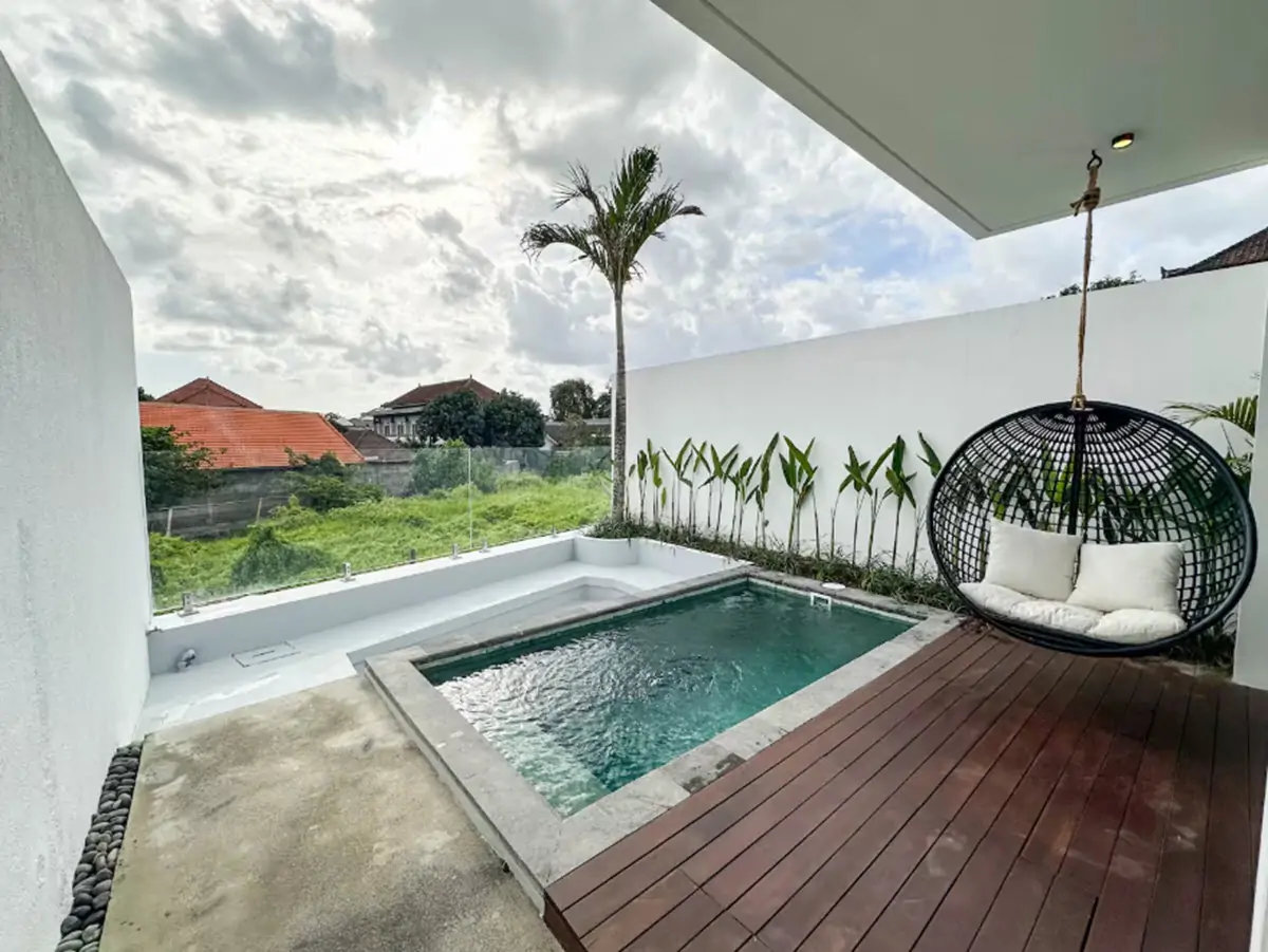 Located in sought-after Tibubeneng, this stylish two-story “Tiny Villa” blends modern comfort with Balinese charm. It features two bedrooms, a modern kitchen, flexible living spaces, an outdoor bathroom with soaking tub, and a private plunge pool overlooking rice fields.